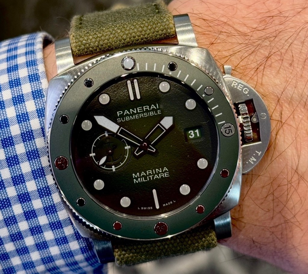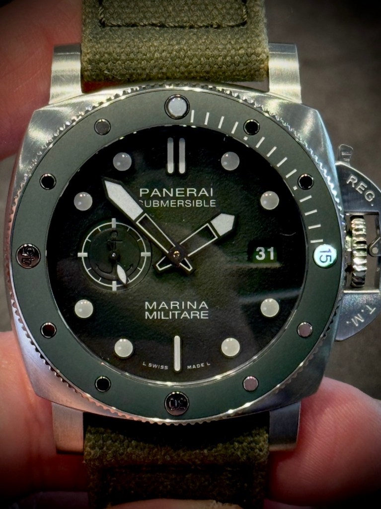 While the watch industry as a whole is trending back towards case sizes in the 39-42mm range, Panerai continues to offer options in those dimensions and remains a go-to-brand for anyone who loves strong wrist presence. If you’re looking for a watch with real heritage, military inspiration, excellent build quality, and immediately recognizable, Panerai is absolutely worth exploring – especially the PAM01697, with its stunning green bezel, matching green dial, and perfectly paired green textile strap.
