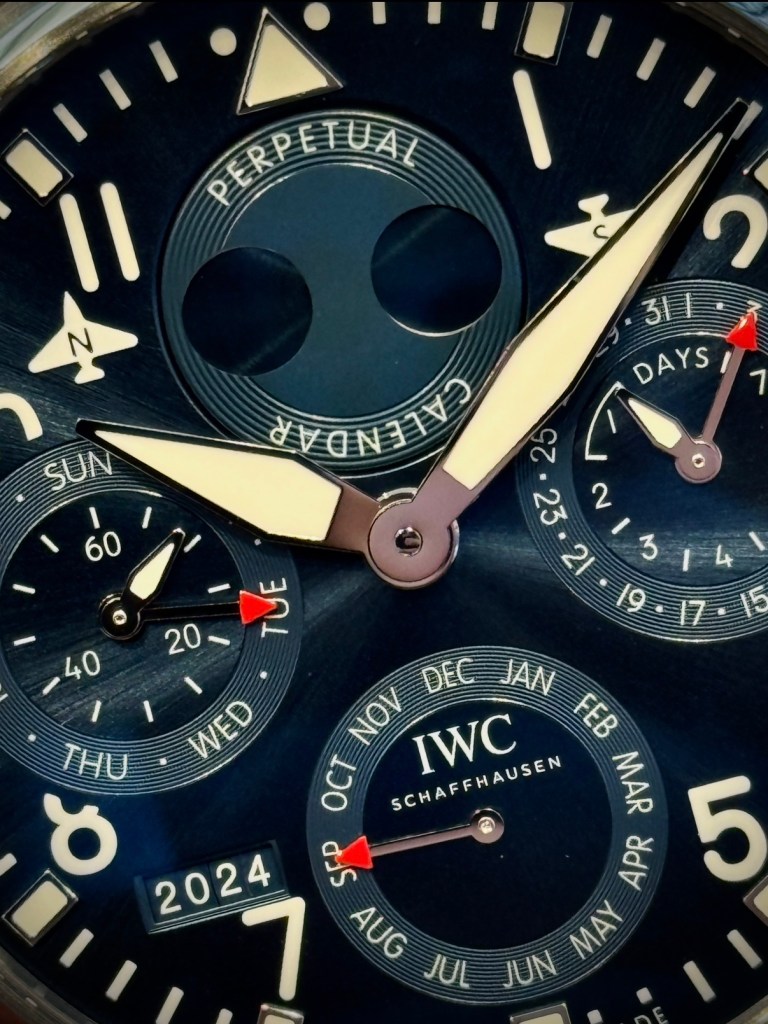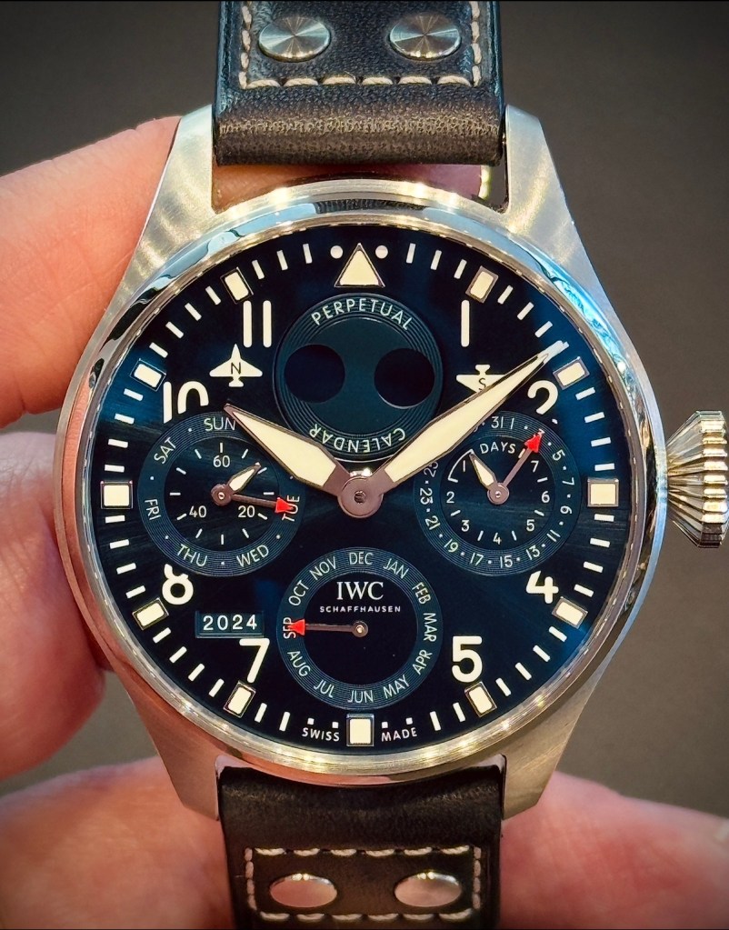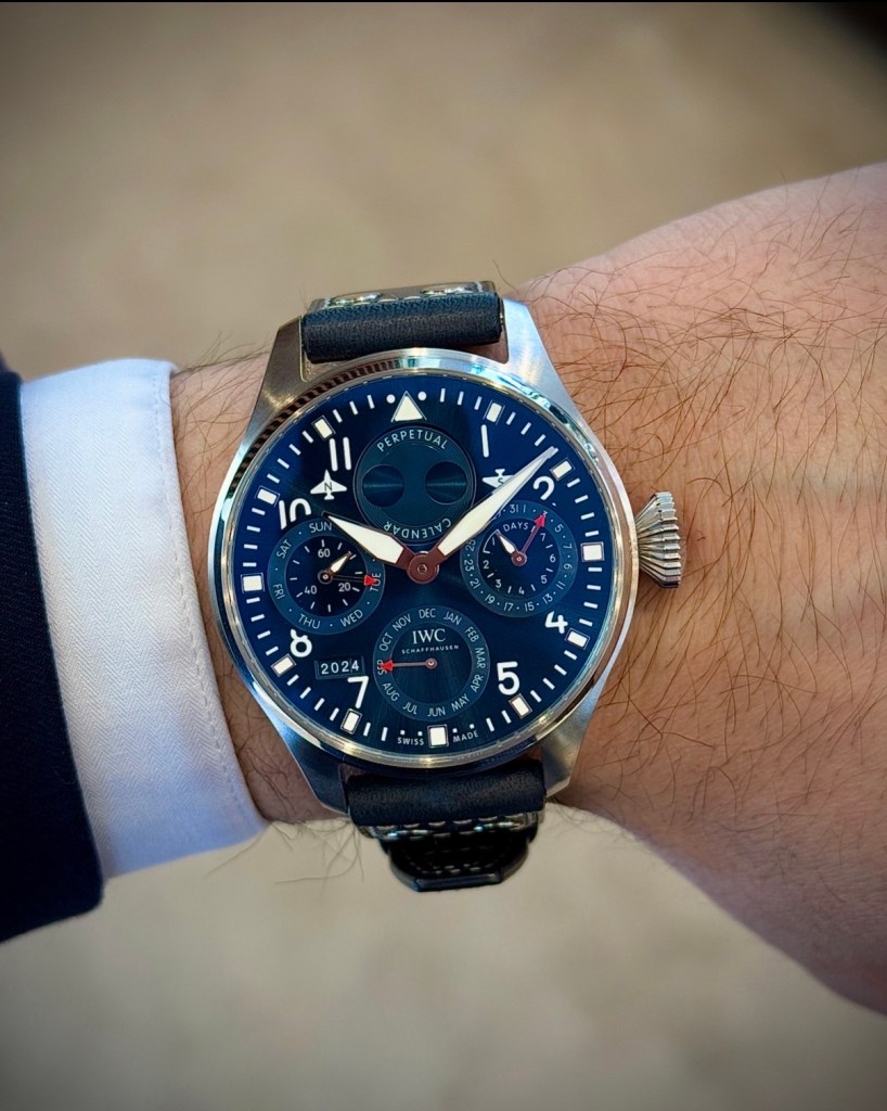 This watch measures 46mm in diameter, delivering substantial wrist presence while still maintaining balance and wearability. Despite its high complication, it stays true to the Pilot’s Watch DNA – clear, legible, and purpose-driven. The dial remains easy to read, even with the complexity of a perpetual calendar on the dial.